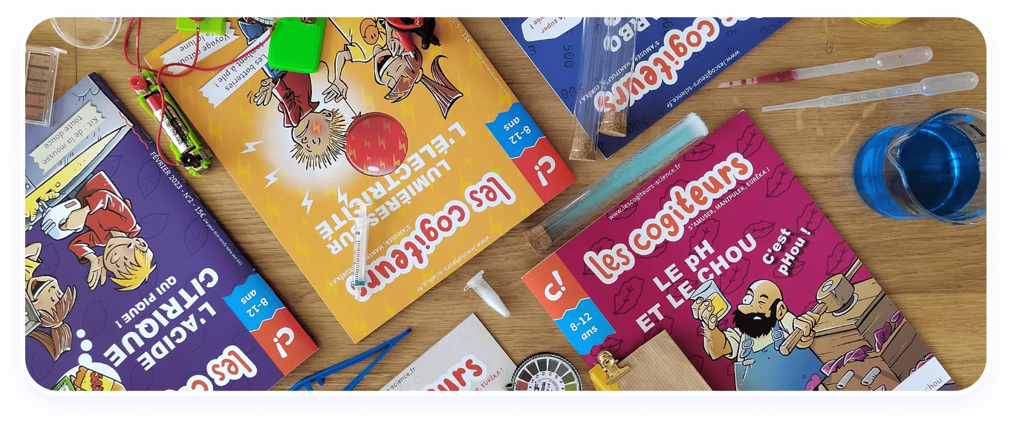 Les Cogiteurs est un abonnement mensuel qui propose aux parents des kits d’expériences scientifiques pour leurs enfants. Chaque mois, les abonnés reçoivent :
