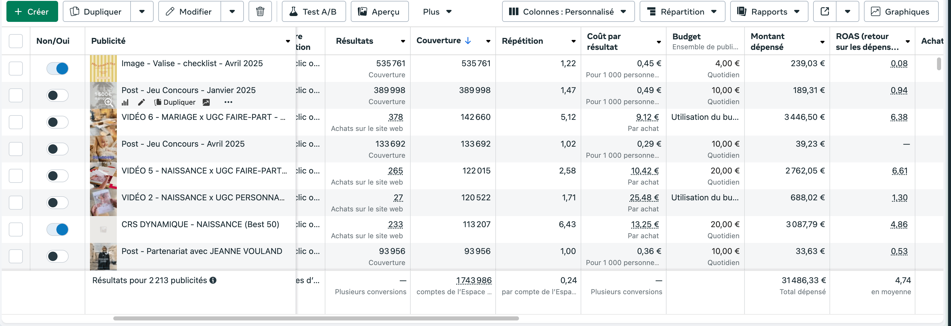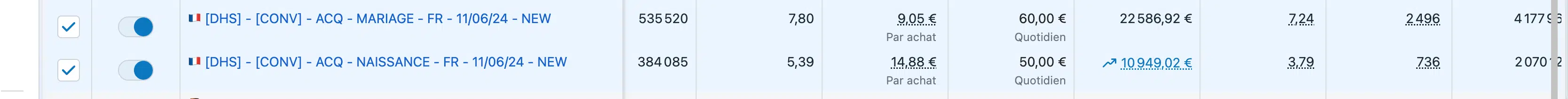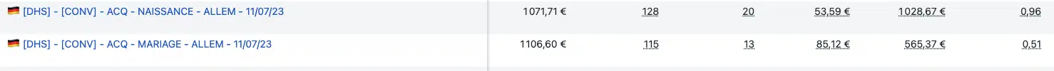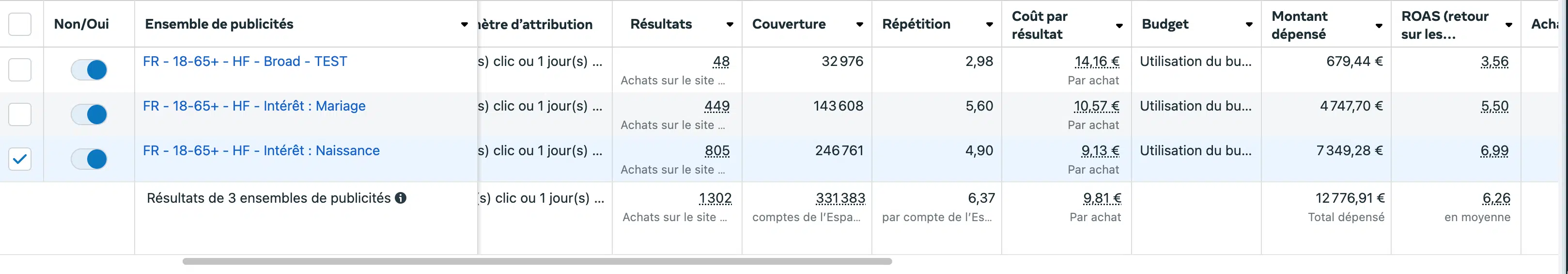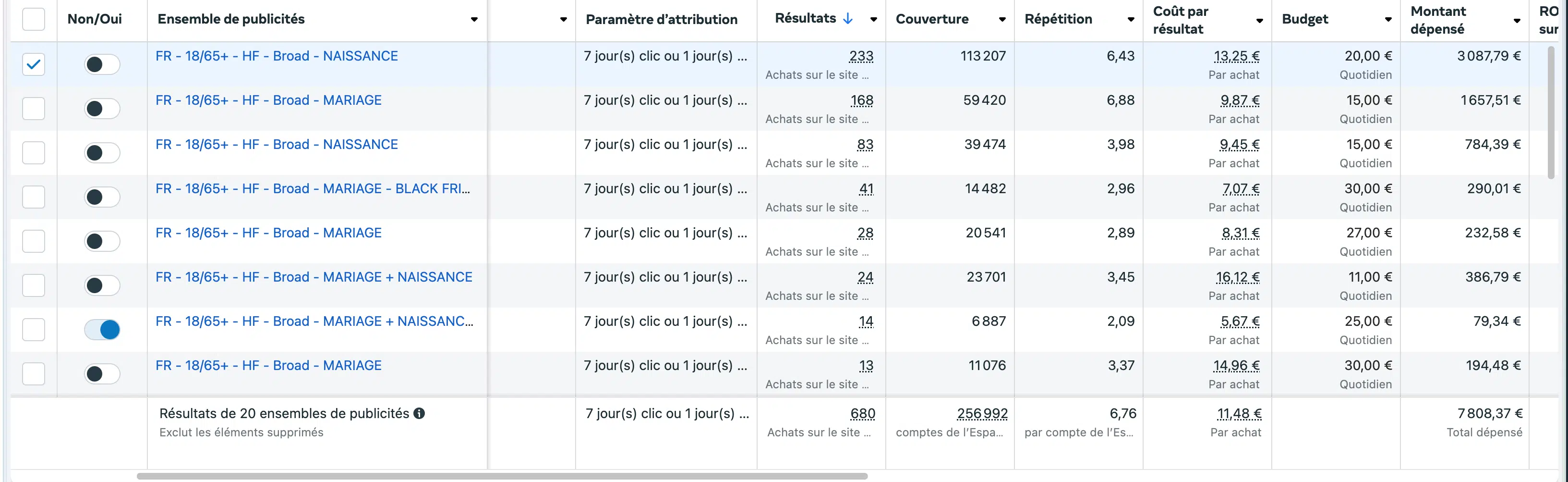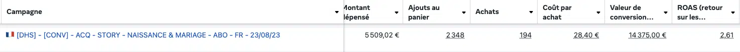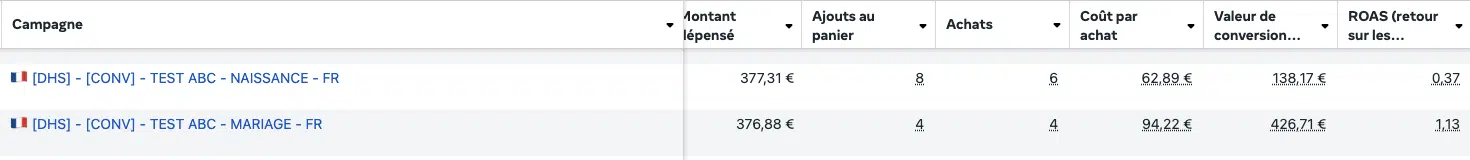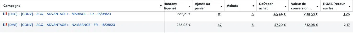 Pour simplifier la structure et favoriser la montée en budget, nous avons fait le choix de les fusionner en une seule campagne Advantage+ combinant Mariage et Naissance.