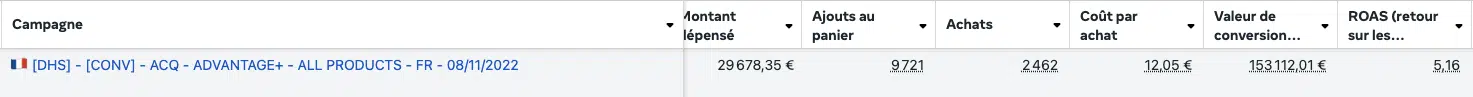 Avec l’amélioration du ciblage Advantage+ de Meta, nous avons choisi de les mettre en pause pour concentrer nos efforts sur le testing de créatifs, devenu un levier beaucoup plus impactant sur ce compte.