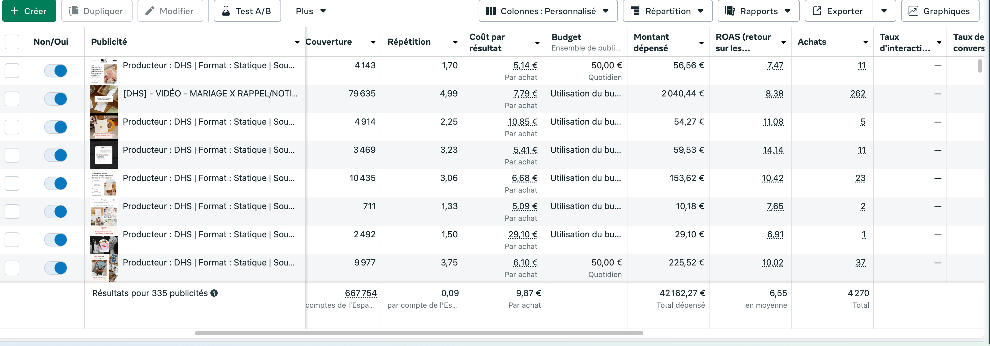 Les tests menés ont montré que la gamme Mariage était nettement plus performante que la gamme Naissance sur la majorité de l’année. Nous avons donc alloué une part plus importante du budget à la campagne Mariage, tout en ajustant la production créative en conséquence (plus de contenus développés pour cet univers).